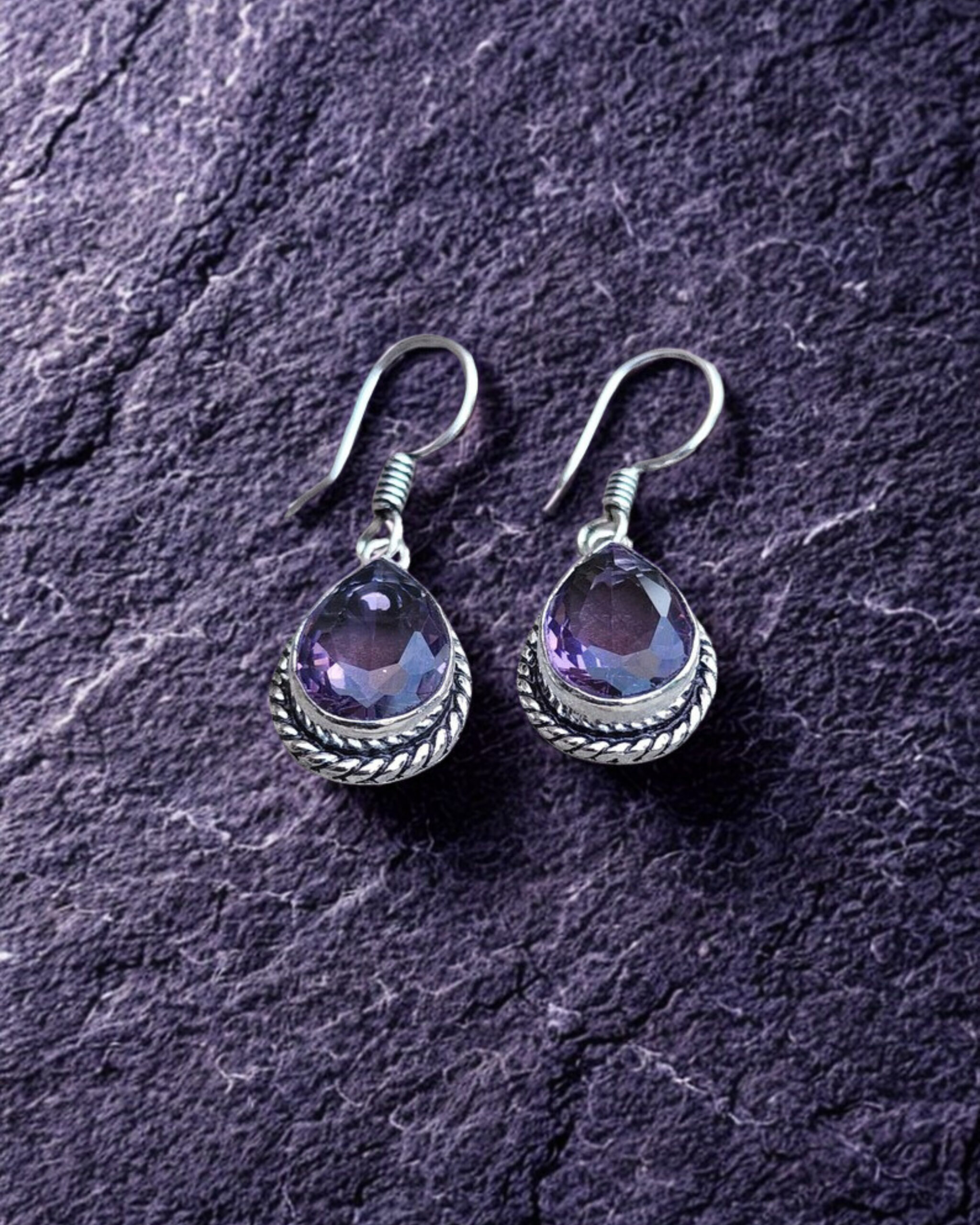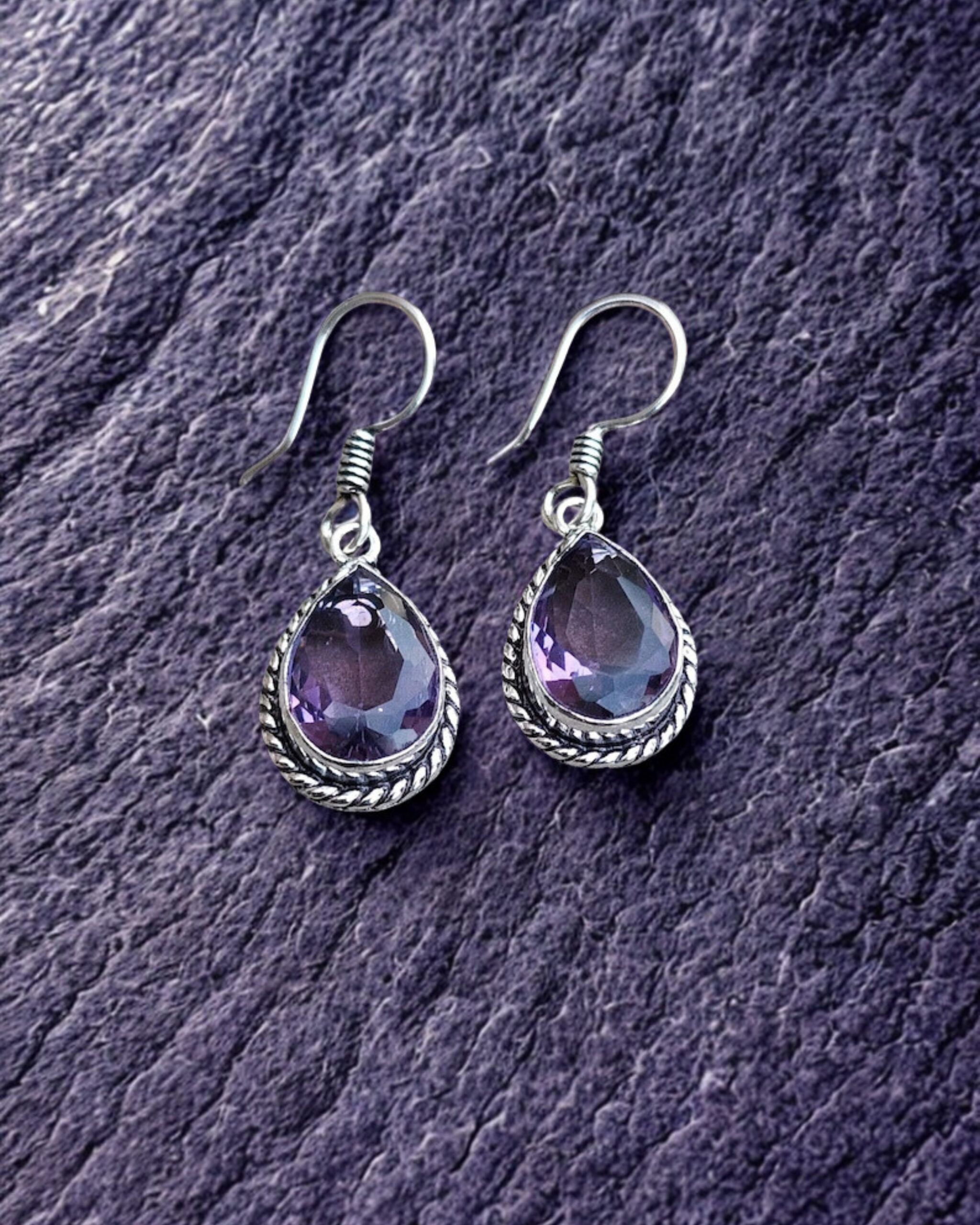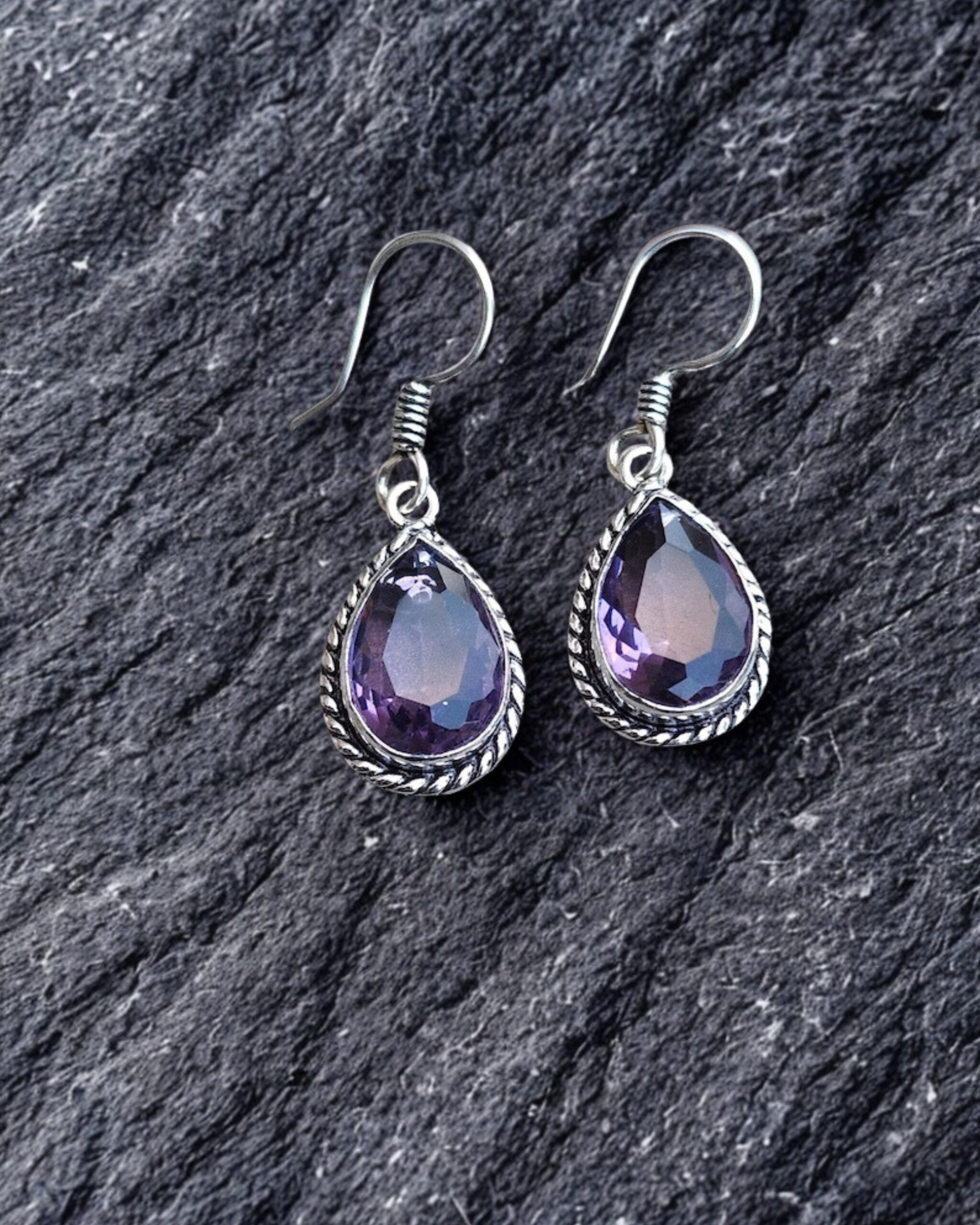These graceful Royal Amethyst Teardrop Earrings are handcrafted in 925 silver, featuring faceted natural amethyst gemstones in a classic teardrop silhouette. The rich purple hues catch the light beautifully, framed by a twisted silver bezel that adds texture and artisan charm.
