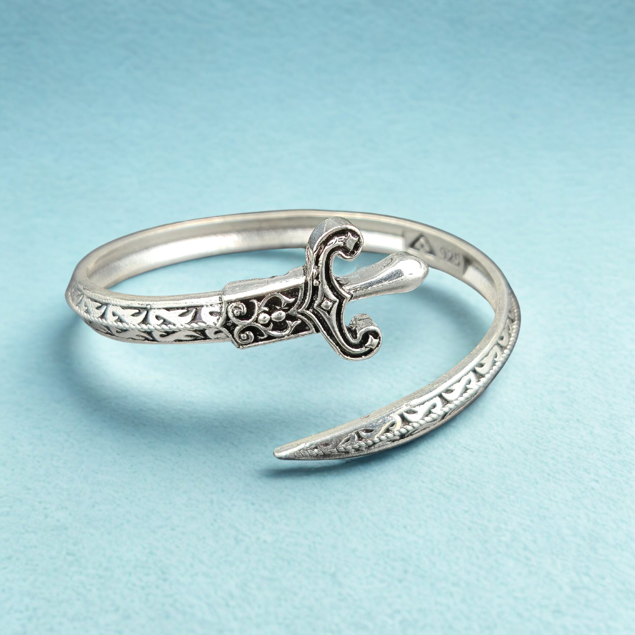 The oxidized finish highlights every fine detail, giving this piece a rugged yet elegant character. Strong, powerful, and unmistakably unique, this sword bracelet is perfect for those who appreciate meaningful jewelry with a story behind it. Its adjustable open-cuff design ensures a comfortable fit for most wrists, making it suitable for both men and women.
